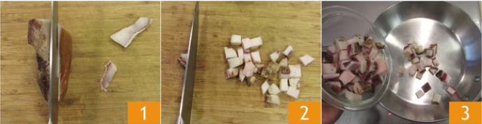 Per preparare la Carbonara, iniziate dal guanciale: eliminate la cotenna e la parte pepata, per evitare che bruci in cottura. Tagliatelo a cubetti grandi (0,5x0,5 cm). Mettete una padella sul fornello caldo e aggiungete il guanciale, fatelo rosolare senza aggiungere altri grassi e portatelo a un colore rosa-oro senza bruciarlo.
