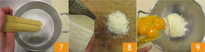 Fate bollire l'acqua per la pasta. Quando bolle, aggiungete un po' di sale, buttate la pasta e cuocetela al dente. Nel frattempo, grattugiate il Pecorino e il Grana Padano. Mettete il formaggio grattugiato in una ciotola d'acciaio. Rompete le uova e aggiungete solo i tuorli.