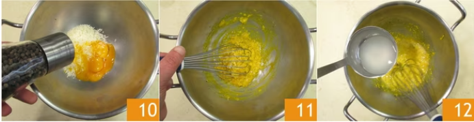 Aggiungete pepe appena grattugiato. Iniziate a mescolare con una frusta a mano, poi usate un mestolo per aggiungere un po' di acqua di cottura della pasta e mescolate ancora. Ora trasferite la ciotola d'acciaio nella pentola con l'acqua della pasta, posizionando un mestolo in modo che si crei uno sfiato e l'acqua non fuoriesca.